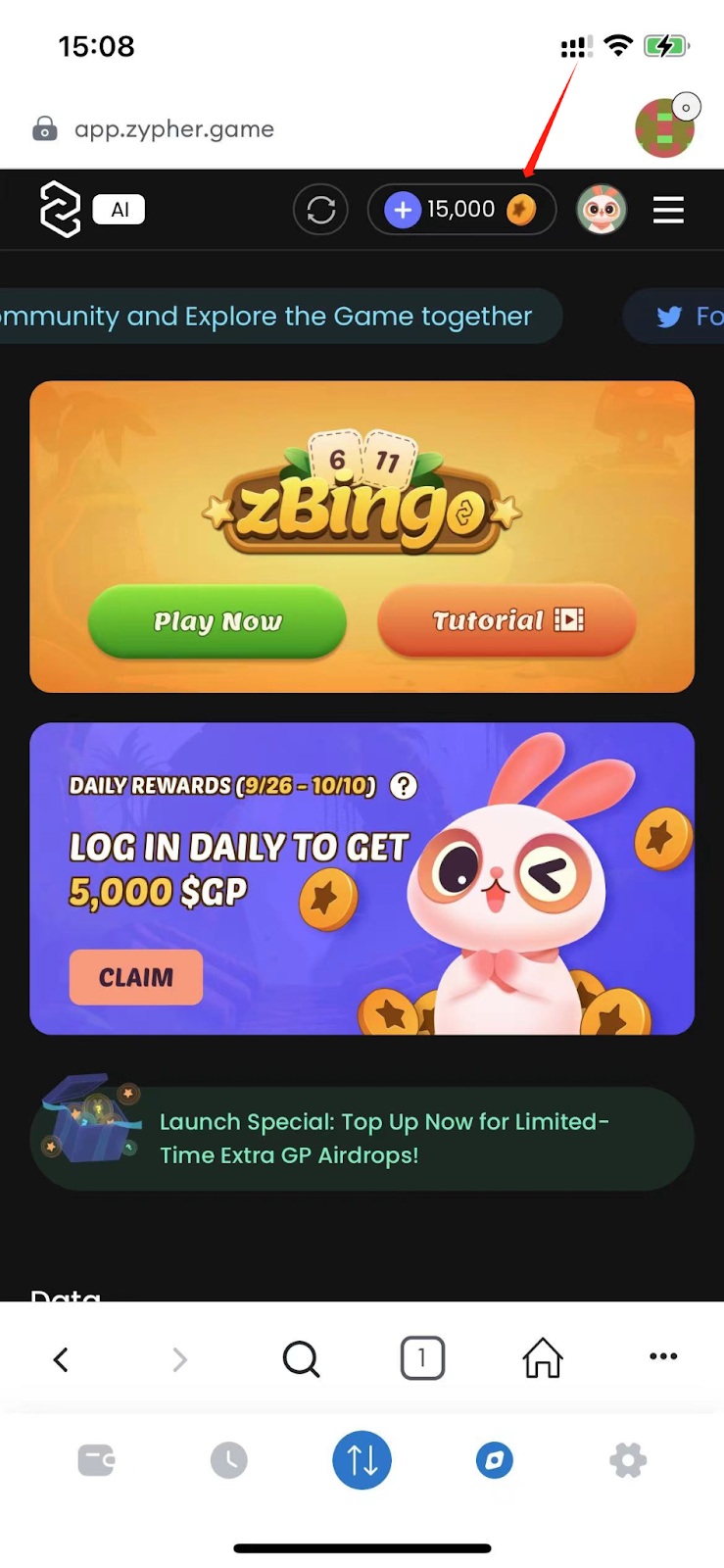 3. Your Gold Points will now be listed under Tokens. Navigate to the search bar below and enter: “app.zypher.game” to visit the Zypher Games App.